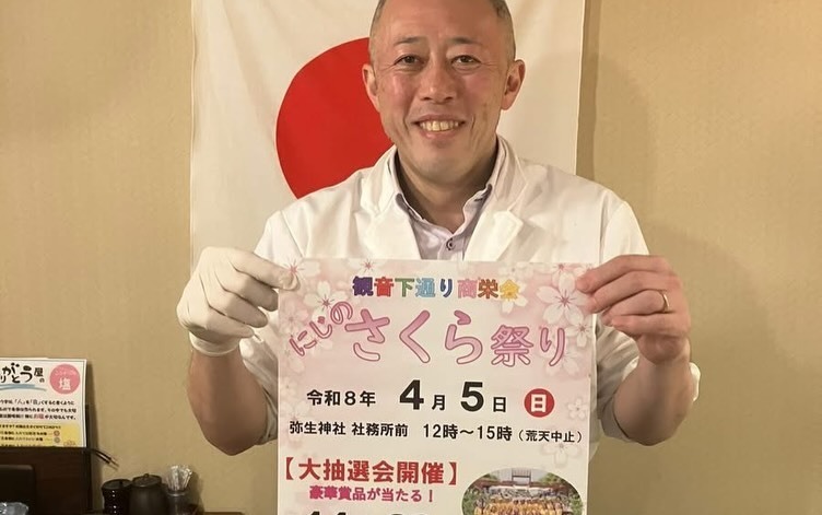 12:00〜弥生神社でありがとう屋が所属する観音下通り商栄会か主催のさくら祭りが開催されます✨